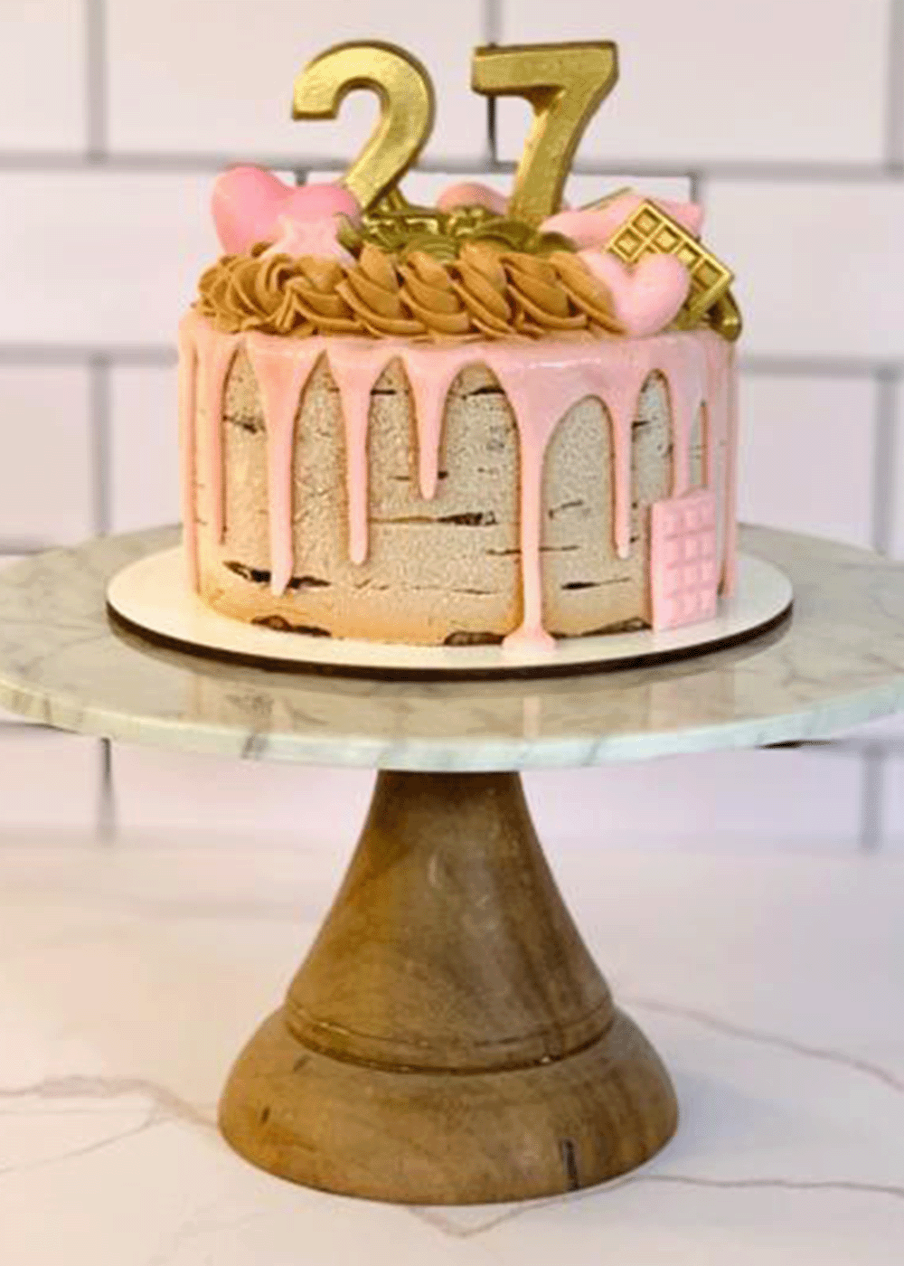 Drip cakes, letter y number cakes, tortas forradas, y cubiertas con butter cream o gabache de chocolate.