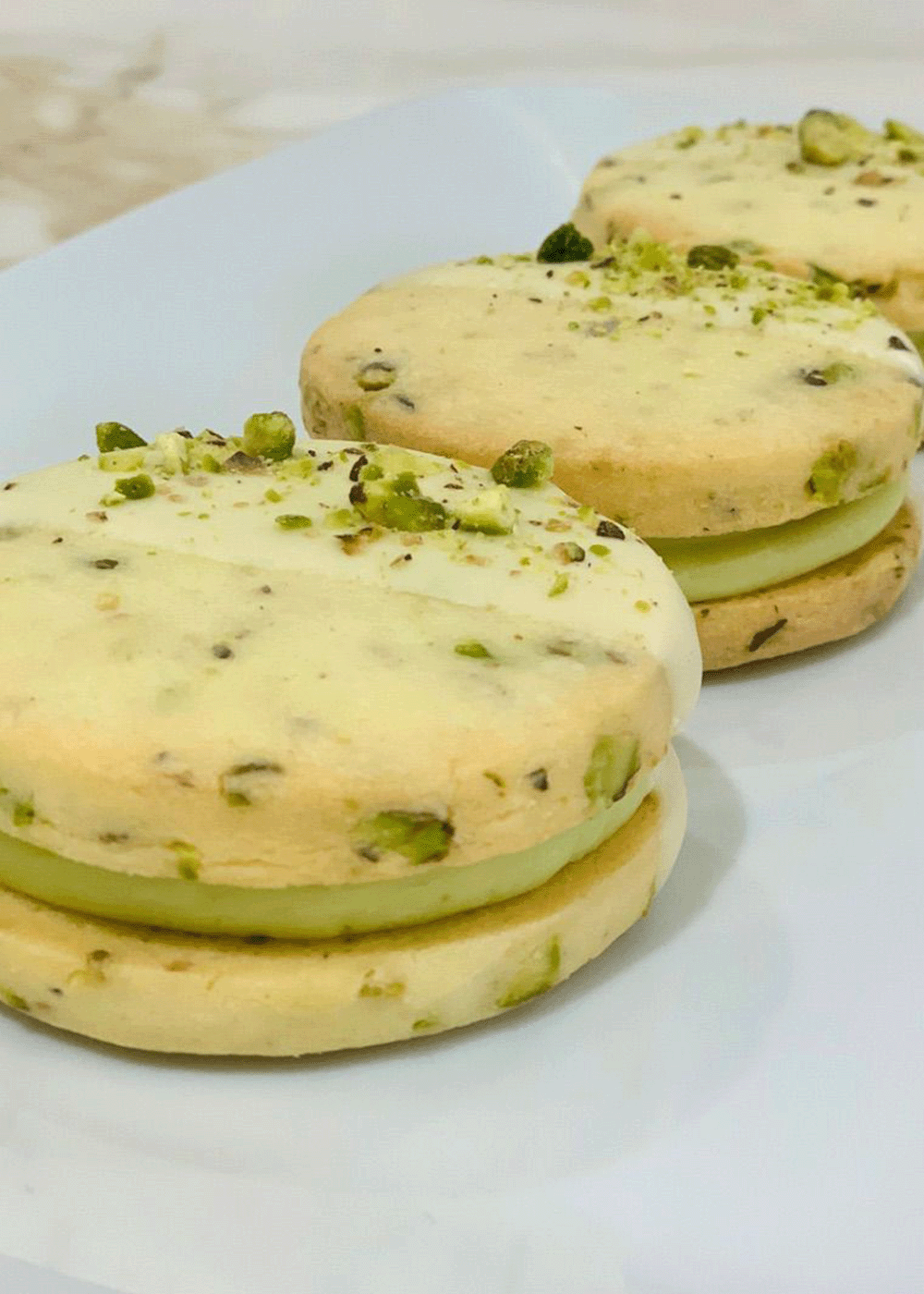 Tapas de vainilla, relleno de ganache de limón y pistacho, con baño de chocolate blanco.