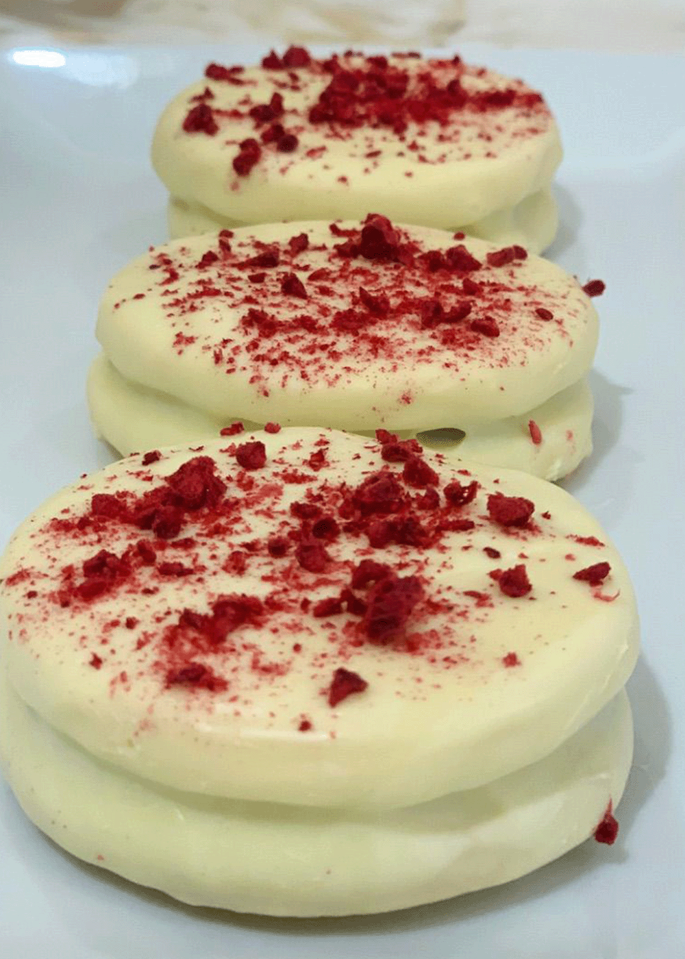Tapas de vainilla, relleno de dulce de leche y confitura de frutos rojos, con baño de chocolate blanco.