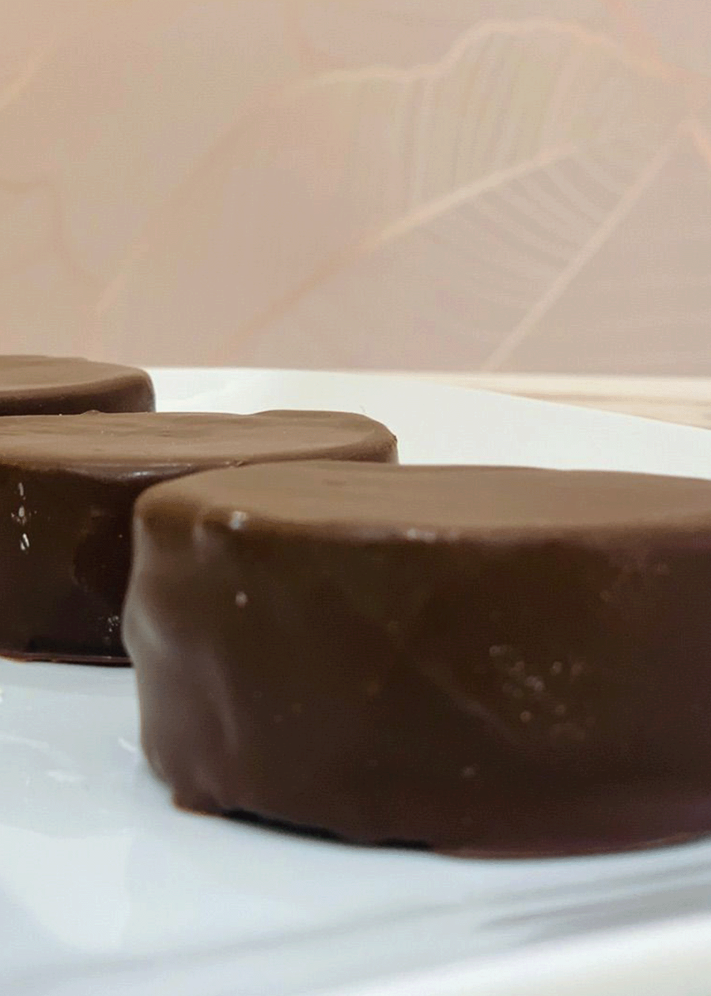 Tapas de chocolate, relleno de dulce de leche, y cobertura de chocolate semi amargo.