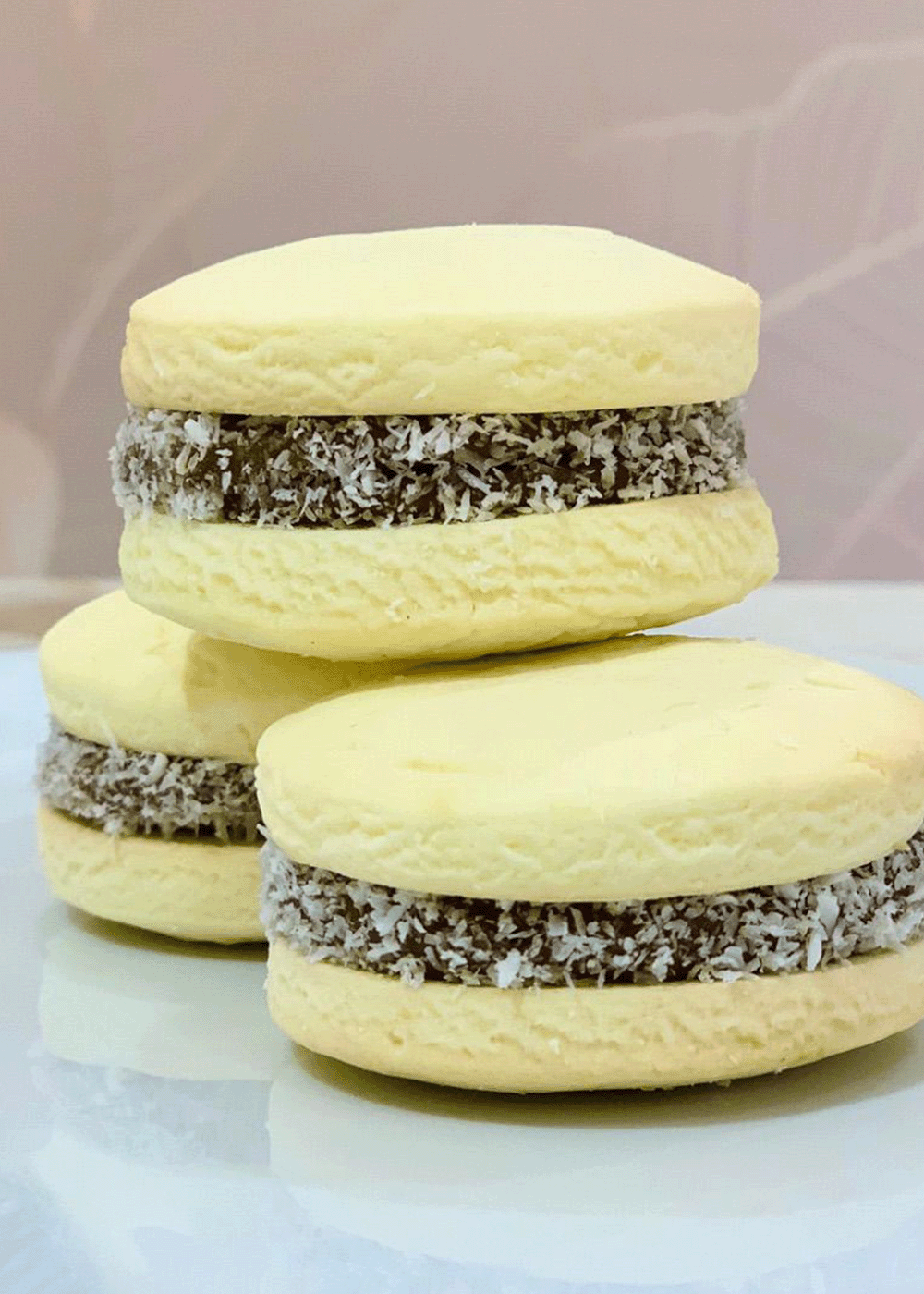 Tapas de galleta a base de maicena, unidas por abundante dulce de leche, con rebozado de coco rallado.