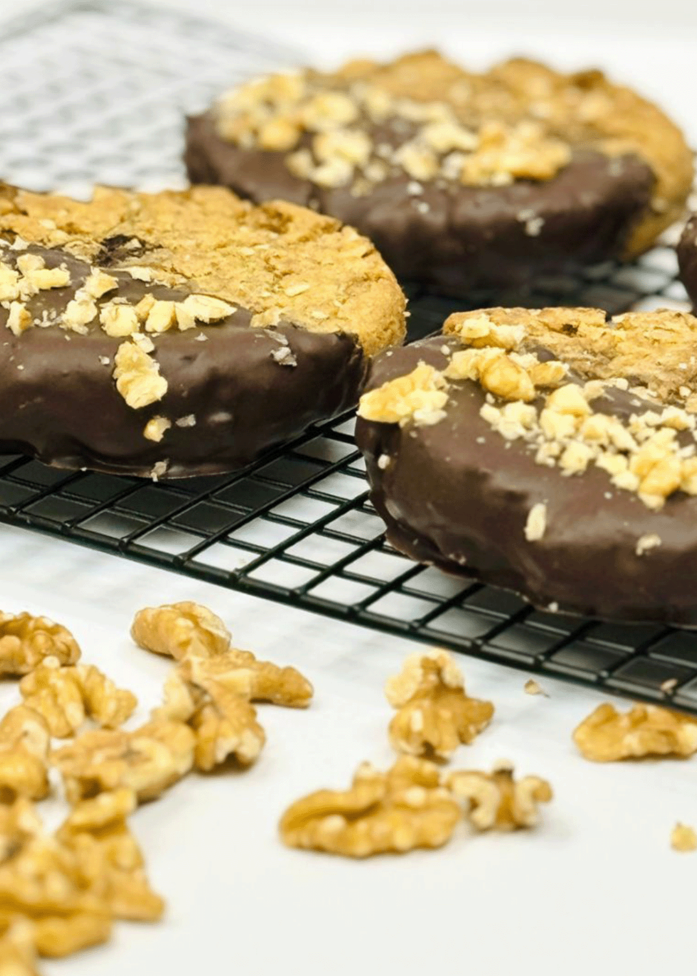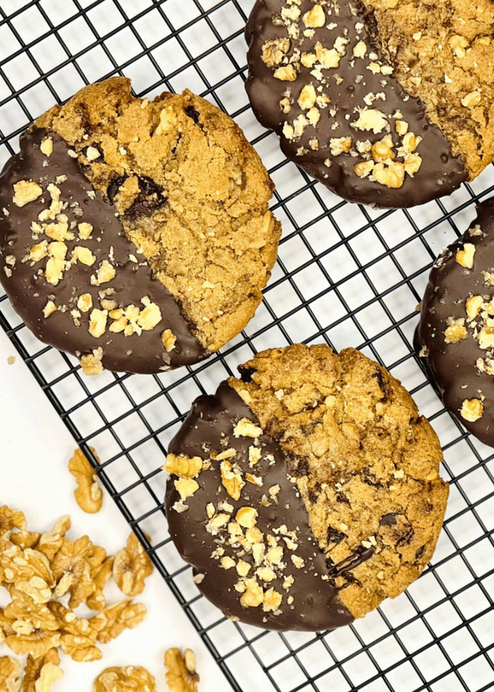 COOKIE DE CHOCOLATE Y NUEZ: Cookie de 150 gr con chips de chocolate y nueces, con medio bańo de chocolate semi amargo.