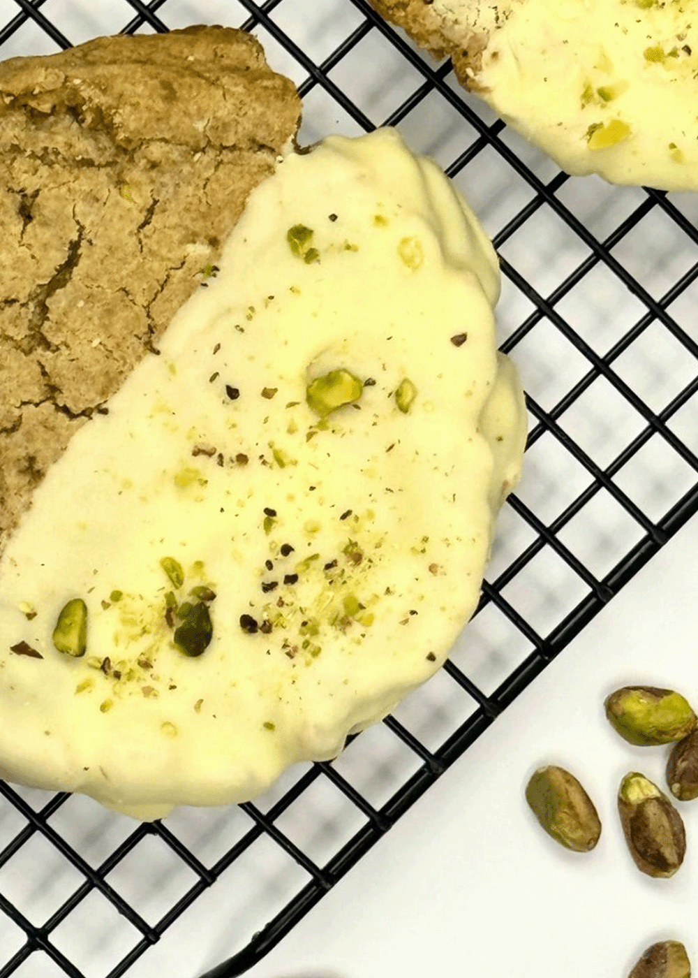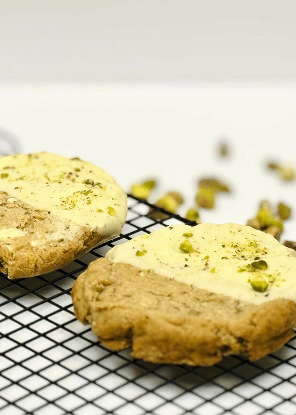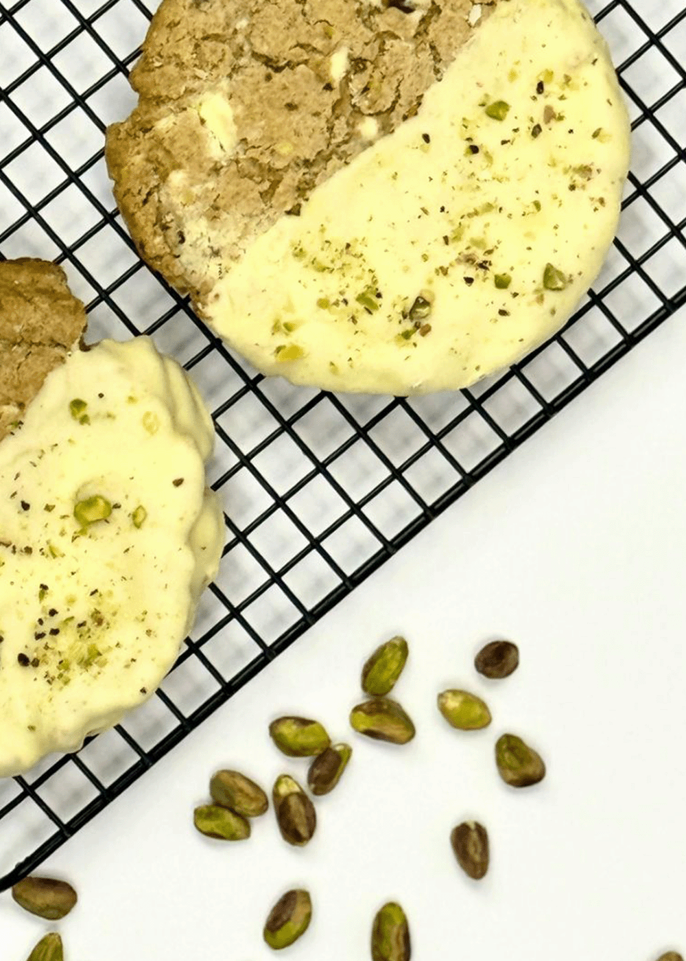 COOKIE DE PISTACHO Y CHOCOLATE BLANCO: Cookie de 150 gr con trocitos de chocolate blanco y pistacho, con media cobertura de chocolate blanco.