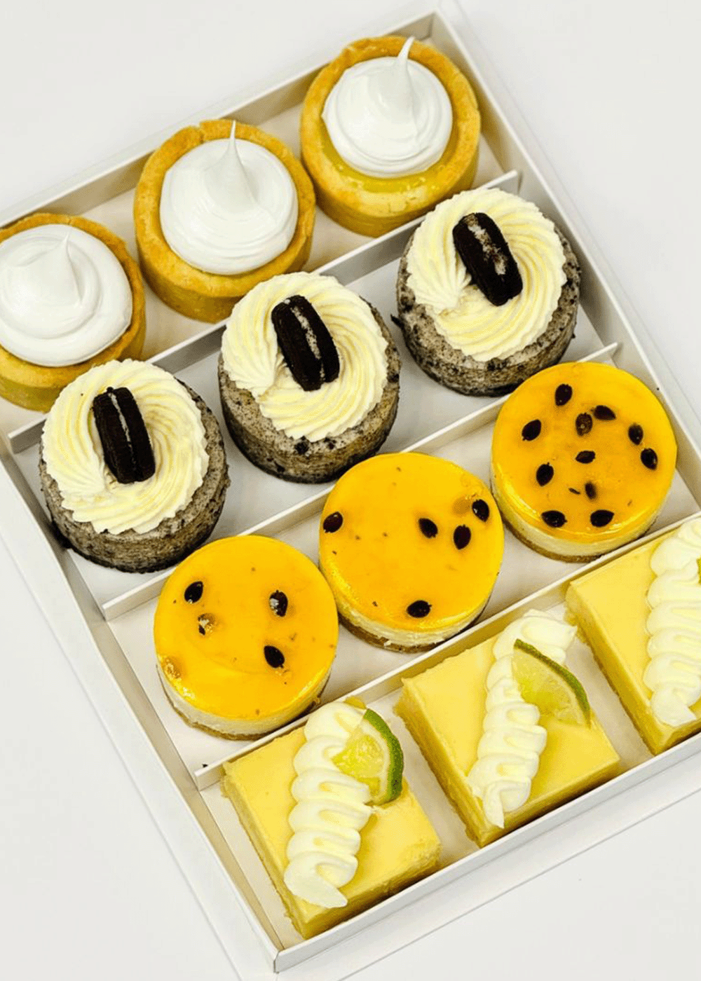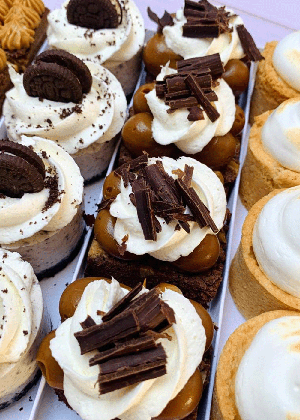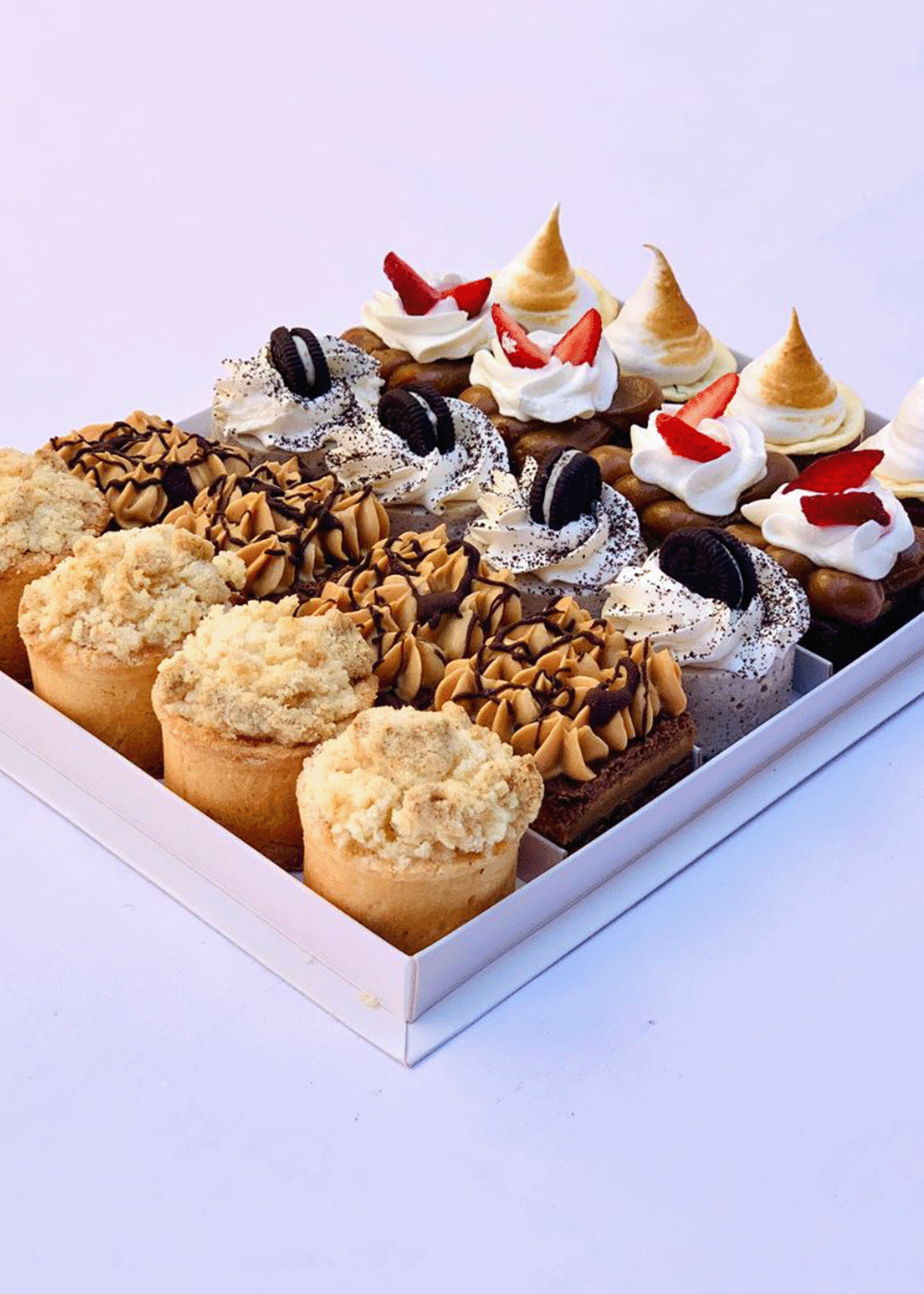 Te las presentamos en caja de 20, 12 y 6unidades. Podes combinarlas entre 12 variedades diferentes: Torta Brownie, Rogel, Lemon Pie, Cheesecake con frutos rojos, Crumble de Manzana, Torta Oreo, Cheesecake de Chocolate Blanco con Maracuyá, Chocotorta, Coco con Dulce de Leche y Marquise de Chocolate, Key Lima Pie y Tarta de Chocolate, Mani y Caramelo. Por cual vas a comenzar?